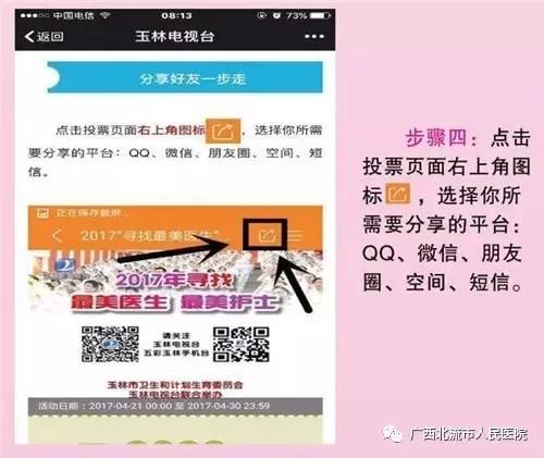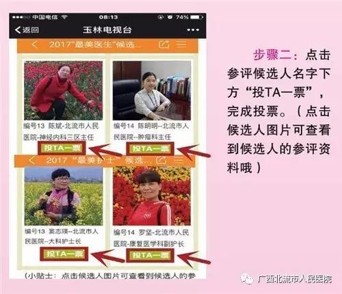 为了让更多群众了解和理解一线医务人员的工作,全面展现玉林市各医院医生、护士在工作岗位中全心全意为患者服务的良好精神风貌,结合开展“两学一做”学习教育,进一步宣传卫生计生系统先进典型,传递正能量。由玉林市卫生和计划生育委员会、玉林电视台联合主办的(玉卫发﹝2017)12号)2017年寻找最美医生、最美护士活动现已开启。我院陈斌、陈明明、窦志瑛、罗坚共四位候选人参加本次评选活动,投票从4月21日开始,请为这四名候选人投上您宝贵的一票。