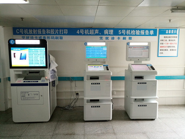 自助打印系统类似银行自助取款机,检查者只需在自助打印机上的读卡器上刷一下就诊卡或扫描放射条形码,就可以轻松便捷地取得自己的检查检验报告单。每份报告在自助打印机上只可打印一次,患者可以根据自己的时间安排到医院自助打印。该系统还能自动判断报告是否完成,若报告已经完成,系统自动打印出报告单;若报告未完成,系统会提示检查结果正在处理中。