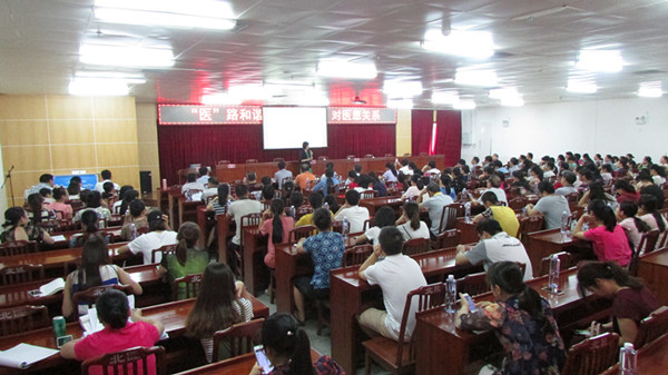 10月12日下午,我院内科楼十三楼会议室传出潮水般的掌声,我院特别邀请到了上海交通大学海外教育学院的童海伦教授、江苏恒瑞医药股份有限公司许益龙总经理为全院员工作以《“医”路和谐,轻松“映”对医患关系》为主题的讲座。讲座由我院医纠办李民主任主持,吴显儒副院长作了总动员,全院300多名员工参加了讲座培训。