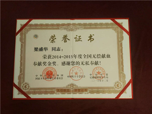 2008年和2016年,梁盛华两次获得国家卫生部和中国红十字总会授予的“无偿献血奉献奖”金奖。20年来,梁盛华每年坚持无偿献血2—4次,每次献血400 ml,至今已累计无偿献血超过20000ml,用爱心和鲜血谱写了一曲奉献者之歌,用实际行动告诉人们无偿献血利人利己,用自己的无私付出诠释着一名医者的宽阔朐襟和高尚情操。