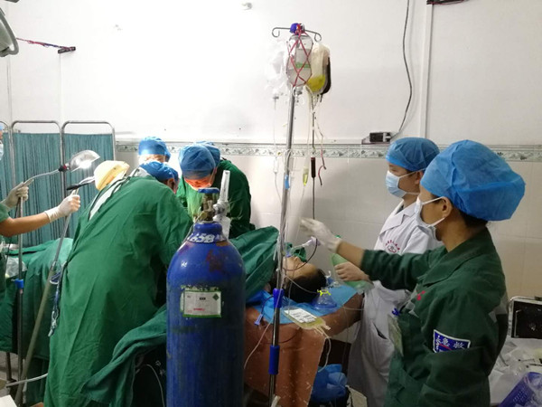 病情就是命令!出诊队伍火速集结完毕,手麻科韦永锋主任、黎起通、唐兰英、党玉娟,妇科副主任吕一燕,急诊科肖燕、罗统铭一行人带着手术抢救用品赶赴50公里外的六麻卫生院。经过快速查看病情,患者已全身湿冷,面色苍白,连手术间都无法运转,当即决定就地在处置室进行手术!