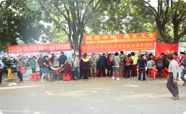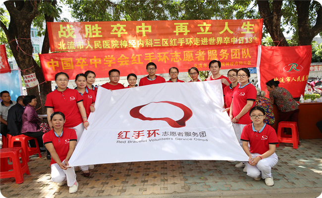 为了进一步提高北流市民对脑卒中的认知,提升居民健康水平,北流市人民医院神经内科三区积极响应中国卒中学会号召,科主任陈斌带领该科红手环志愿者于10月29日上午,在内科楼门前隆重举行“战胜卒中  再立人生” ——2018年“世界卒中日”健康科普义诊活动。