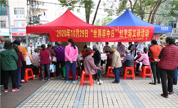 2020年10月29日是第十五个“世界卒中日”,为积极响应中国卒中学会发出的关于开展以“医体融合,预防卒中”为主题的世界卒中日健康科普活动的号召,北流市人民医院神经内科三区陈斌主任组织红手环志愿者服务团,联合呼吸与危重症医学科莫剑主任、康复医学科李广森主任、中医科李夏林副主任等一行20多名红手环志愿者于上午在北流市南园公园广场开展大型红手环健康科普义诊活动。此次义诊活动以“科学运动,健康生活”为口号,宣传卒中防治的科学方法,积极倡导“大健康”的生活理念。