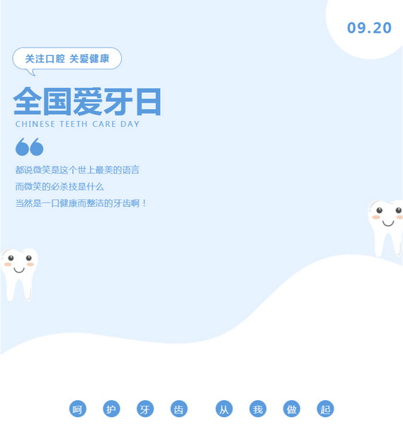 2021年9月20日是第33个“全国爱牙日”,今年的活动主题是“口腔健康 全身健康”,副主题是“从小养成刷牙习惯 一生乐享健康生活”,旨在贯彻落实《健康中国行动(2019-2030 年)》和《健康口腔行动方案(2019—2025年)》的指导方针和政策,提升群众口腔健康素养,创建有利于口腔健康的社会氛围,重点关注儿童口腔健康。
